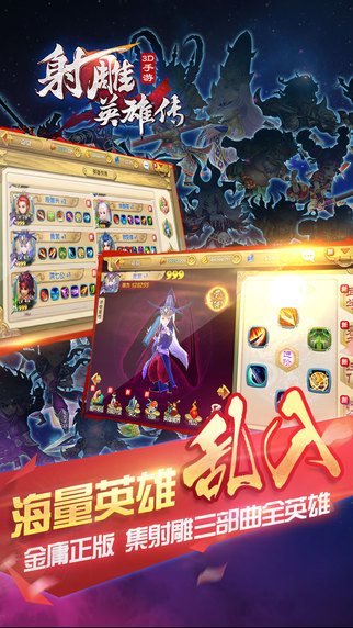 该作是一款金庸正版授权改变的东方武侠题材的动作RPG手机游戏。游戏主要让玩家体验射雕中原汁原味的剧情表现故事,并且收集不同的武侠英雄,例如:黄蓉、郭靖、欧阳锋、黄药师……等英雄,通过不同的英雄组合玩出不同的搭配策略玩法。每个英雄都有自己独有的技能效果玩法。