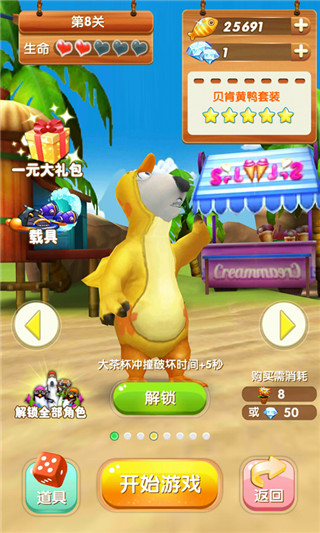 原版动漫角色十足趣逗感,呆萌形象步入我法眼的第一刻,这个我给满分,《倒霉熊2016》从开场画面,到整体的按钮布局,背景样式,气候细节,再到游戏内的画面细节,整个气氛瞬间让人不禁自乐起来,100%还原了“倒霉熊”趣逗呆萌的几大要素。