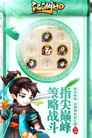 超清巨制,肆意江湖,经典武侠手游《江湖HD》精英测试震撼开启!测试期间登陆游戏领取测试豪礼,超多元宝、强力侠客登录领取,每日签到更有VIP积分任性赠送,更多福利特权点击体验。 经典武侠荣耀来袭,四大主角,数百位江湖名侠悉数登场,掌中江湖指尖战斗,排兵布阵策略制胜!百余种精妙武学相生相克,神兵利器相辅相成,群侠对决快意恩仇,江湖之中人皆大侠!