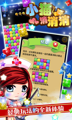 小猫消消消是一款非常容易上瘾很锻炼脑力的消除类游戏,游戏的规则很简单:只需点击两个或两个以上颜色相同的方块即可消除。没有时间限制,每个阶段都有一个目标,完成即可进入下一关。很好的画面,很炫的感觉很到位,值得体验;很刺激的效果音效。