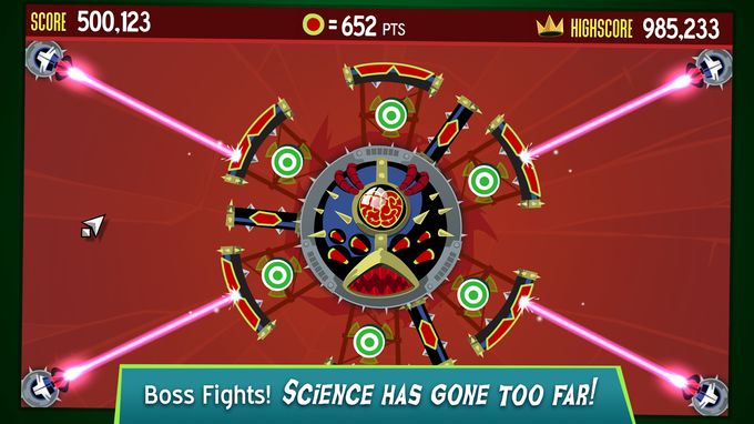 《重力存亡2(Tilt to Live 2: Redonkulous)》是一款有趣的休闲游戏。游戏以简洁明亮的2D画面,来展示了一场与红色分子激烈对抗的世界。看着自己操纵着的白色的三角箭头战机,在大量的红色的分子之间穿梭,然后取得不同效果的武器,将红色分子消灭的场景,实在是感觉很不错。多样的武器光影效果,也令游戏画面的华丽度得到了很好的体现。加上节奏轻松明快的音乐,和使用武器时有趣的声音,让人玩起来的感觉乐趣十足。