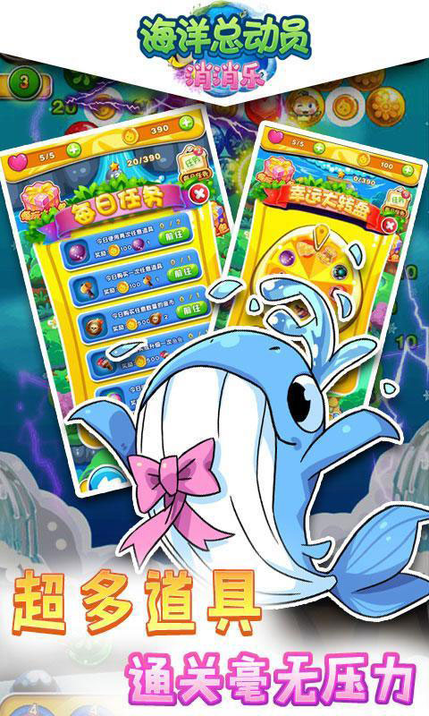 《海洋总动员消消乐》一款清凉的消除游戏!点击两个以上相同的海洋生物即可消除掉。一次消除的小动物越多,每关最后剩余的小动物越少,得分越高!分数越高,通过的关卡数就越多。合理使用道具可以极大的提高分数,更有超值的永久道具等待你!
