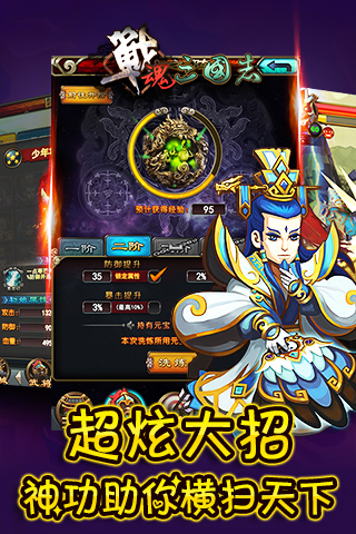 战魂三国志是一款三国题材全景3D动作卡牌手游。游戏以三国题材为故事背景,Q萌卡通风格的三国名将造型,酷炫技能特效以及独创五行元素组合对战玩法,为玩家呈现一个与众不同的三国。风格幽默、休闲恶搞,同时独创多种特色玩法。玩家通过收集和养成不同于一般三国游戏的武将卡牌来体验强化的乐趣,也通过搭配不同的技能卡牌有策略地去取得胜利。玩家可以直接操作卡牌拖动至出牌的窗口自由组合释放技能。语音聊天、互动交友、皇陵探宝、出海打倭寇、挑战神秘塔,轻松操作即可操纵魔化战魂,且看如何颠覆三国!