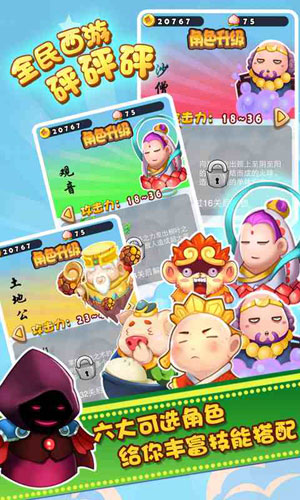 全民西游砰砰砰首创萌西游塔防类型的手游,在战斗过程中可以利用各路神仙来帮忙,更甚至天天被悟空欺负的土地公也可以叫出来帮忙的,游戏的操作非常简单,按住屏幕就可以连续射击了,只要你的连击的次数越多,那么你给的伤害也更多了。