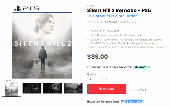 据resetera用户发现,澳大利亚零售商Gorilla Gaming的《寂静岭2:重制版》商店页面显示,游戏将于2023 年 9 月 29 日推出,并且已开启PS5版预定。不过,也不排除只是占位符的可能性。