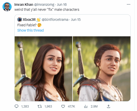 《神鬼寓言》新作预告公布后,不少玩家吐槽女主角太丑。推主Xbox3R用AI修复为其进行了“美颜”,再次引发了玩家们的热议。Game Informer前高级编辑Imran Khan转发了这条推文,并写道:“奇怪的是,你们从来不‘修复’男性角色。”