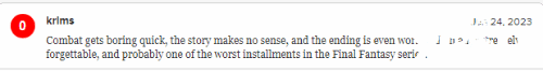 “战斗的快感转瞬即逝,故事毫无意义,结局更是糟糕。本作可能是《最终幻想》系列中最糟糕的一部。”