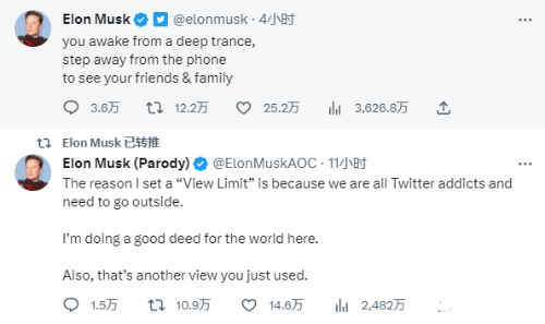 马斯克后续发文解释了实施浏览限制的原因:我设置 "浏览限制 "的原因是,我们都过分依赖使用推特,大家需要多出去走走体验现实生活,多去陪陪自己的亲人朋友,我这是为世界做了一件善事。(提醒一下,看我的推文你又用掉了一次浏览机会)