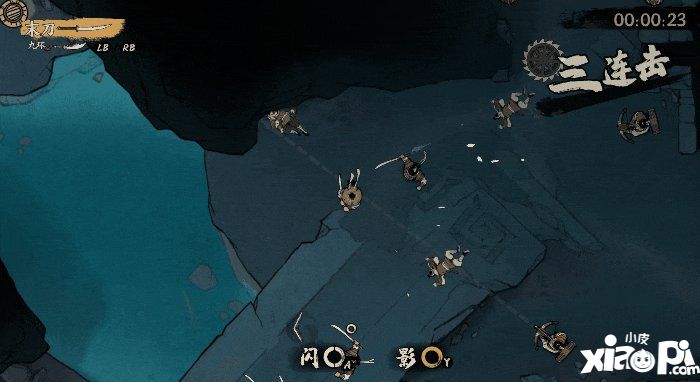 以及,你还可以通过连杀积攒能量,在蓄满“虚影术”之后发动一次短暂的时停。在时停中,只有你能自由行动,你可以用它轻松躲过凶险的机关、密集的箭矢、或是绕到棘手的敌人身后给他一刀——不过,当你挥刀之后,时停便会立刻结束。