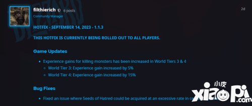 9月15日,暴雪蓝贴宣布《暗黑破坏神4》新热修复补丁现已上线,更新主要提升了世界三和世界四难度下杀怪的经验值,并修复了在某些情况下仇恨种子可能以过高的速度获得的问题。值得注意的是,游戏在本周早些时间还进行过一次经验值上涨更新,赛季祝福「杀意之瓮」的经验值加成从8%提升至了20%。