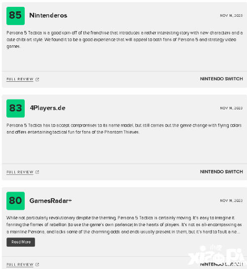 《女神异闻录5:战略版》媒体口碑已解禁,M站均分78分(NS版共收录20篇测评16好评4中评0差评),IGN和GameSpot都给出了8分的成绩。