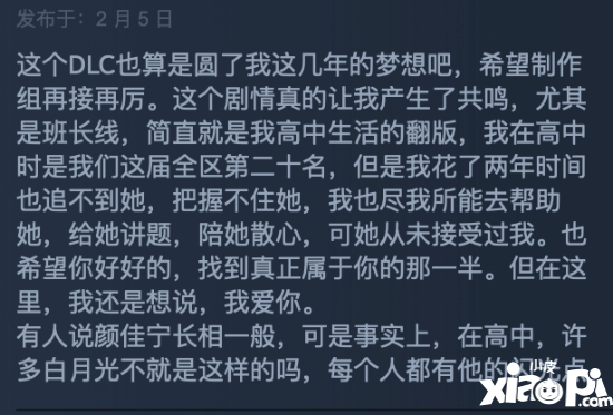 有玩家表示这个剧情让其产生了共鸣,尤其是班长线,简直就是高中生活的翻版。也有玩家表示质量不如本体,需要再接再厉。但总体还是物有所值的。