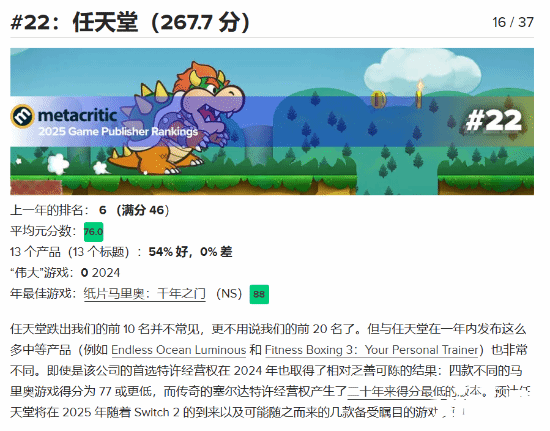 排名大跌破纪录!M站年度游戏发行商:任天堂仅排第22