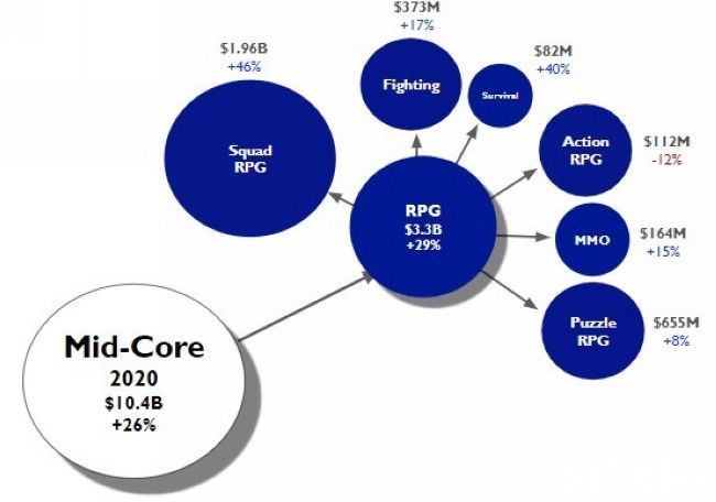 据外媒DoF的统计,欧美RPG年收入已经达到了33亿美元,其中回合制RPG的2020年收入接近20亿美元,同比增幅46%。不过,比较遗憾的是,国产RPG手游除了米哈游的《原神》和莉莉丝的《剑与远征》之外,很难有产品进入收入榜头部。