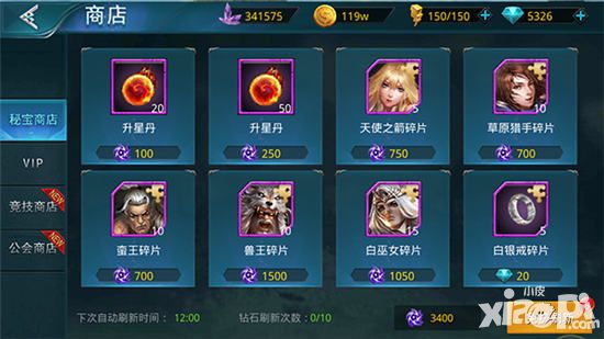商城:商城共分为秘宝商店、公会商店和竞技商店。秘宝商店通过消耗钻石和魂晶购买物品,公会商店通过消耗公会币购买物品,竞技商店通过消耗竞技币购买物品。
