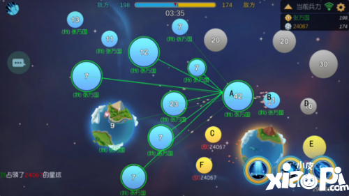 这里有个知识点:你占领的星球越多,单个星球的生产力越低。注意,这个单个星球生产力越低,并不代表总生产力是下降的,在总生产力方面,是占领的越多,总生产力越高,这个是肯定的。可以看到,我在G点集结了兵力,打下了C点,但是AI打下了A点和F点。