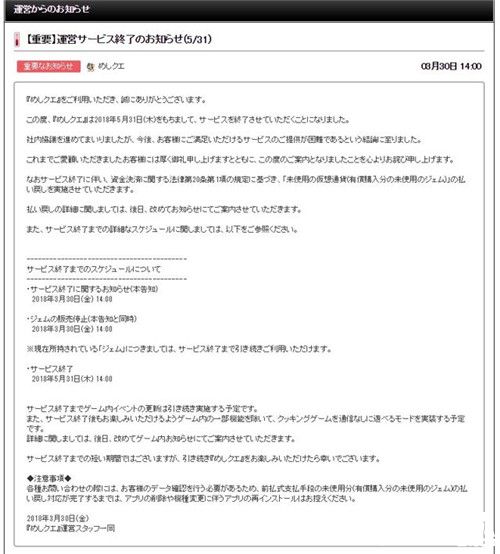 SQUARE ENIX旗下智慧型手机美食游戏《美食任务:五星厨房(Meshi Quest:Five-star Kitchen)》日前于官方站点宣布,预定于日本时间2018年5月31日14:00结束营运。