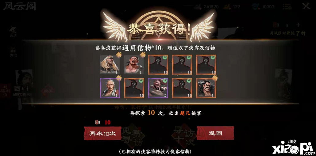 (在侠客贴充裕的情况下,还可以来到风云阁抽取相应侠客。)