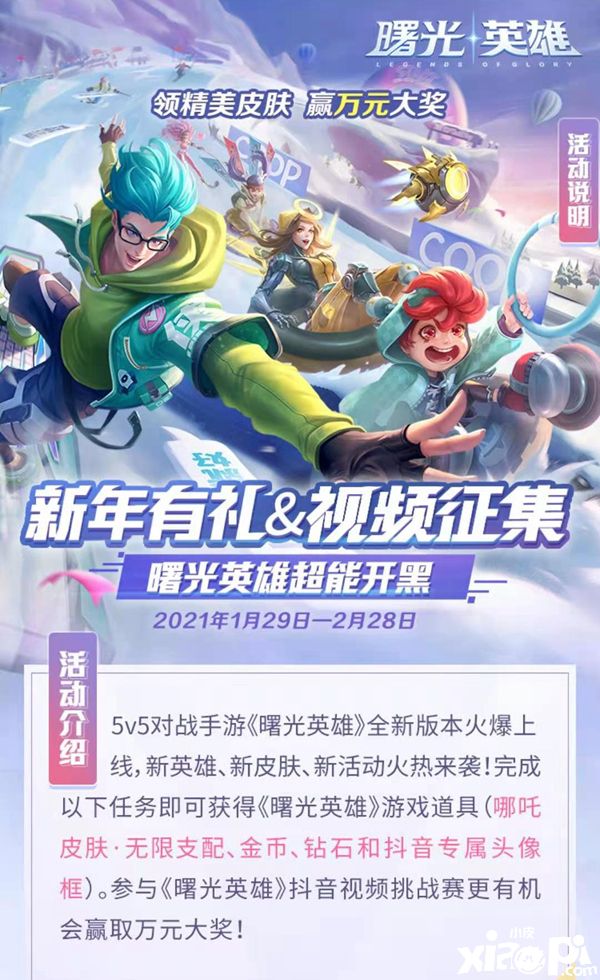 《曙光英雄》在抖音APP开启新年有礼&视频征集活动。现在,你登陆抖音,搜索#曙光英雄话题,进入话题即可参与视频征集活动。玩家在活动页面上传曙光英雄内容的短视频,赢取活动积分,可以免费兑换哪吒新皮肤——无限支配,以及海量钻石、金币等道具奖励。