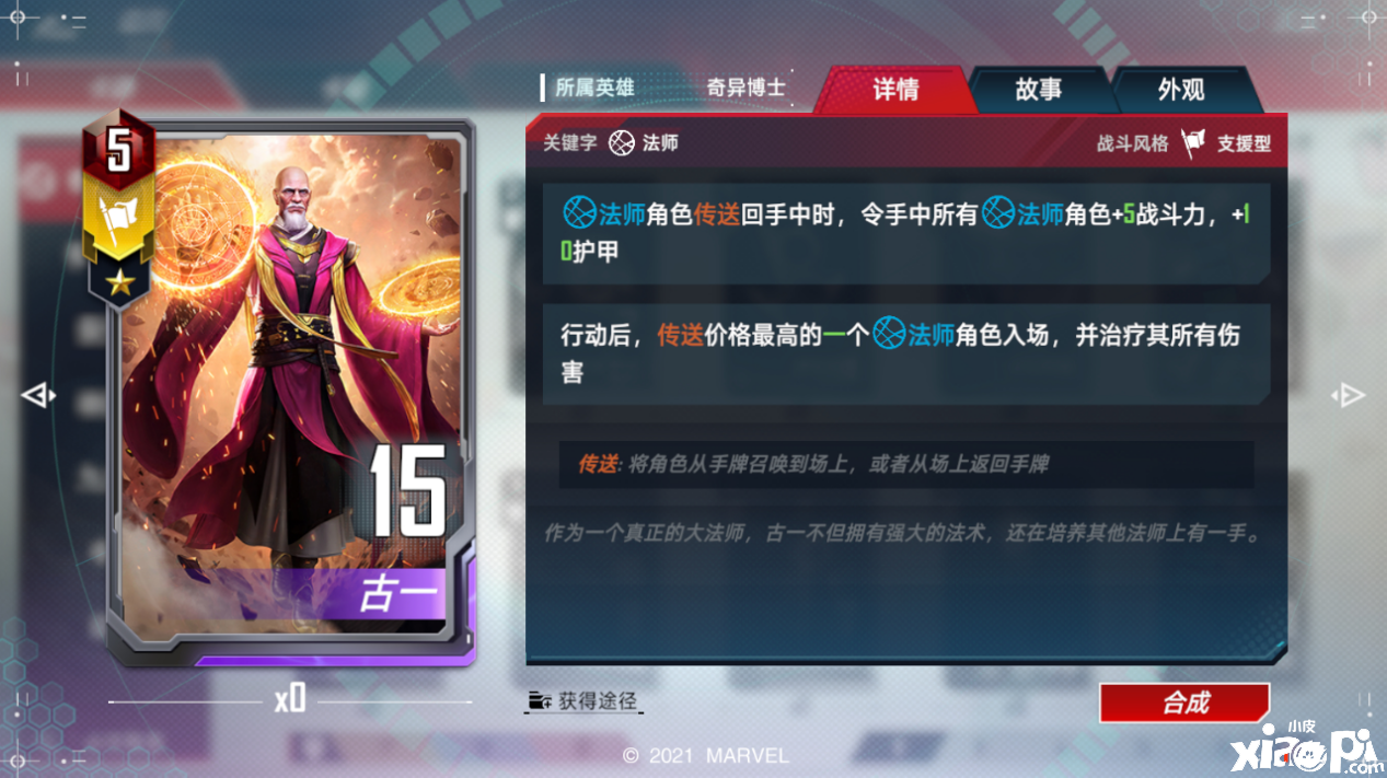 核心卡牌「奇异博士」在被队友「传送」入场之后,能对随机敌人造成等同自身战斗力的伤害并摧毁装备,受到攻击后会「传送」回手中,配合「古一」能不断地打出高额的伤害。