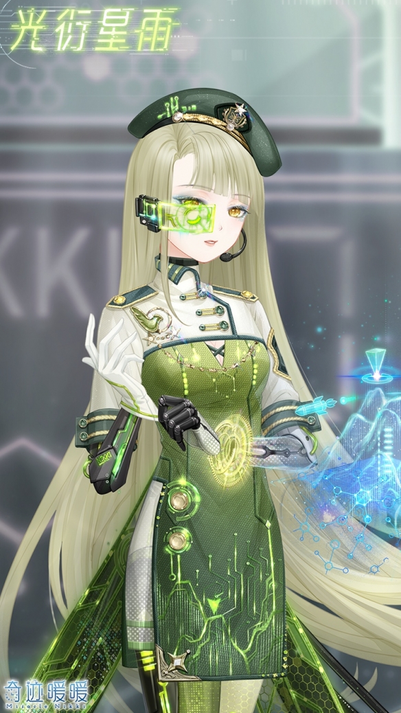 【光衍星雨】含正常姿势与特殊姿势,特殊姿势外套“人造星雨”,特殊姿势鞋子“智械核心”,精美可移动摆件“现实倒影”、“智能播送”。*海报展示妆容为“海阔繁樱”。