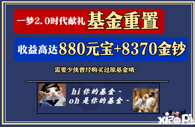 限时千梦基金已经推出!已经购买过重生基金的少侠,可以再购买一次限定的千梦基金,88元享受和重生基金一样880元宝+8370金钞的高额收益!为了让所有处于不同赛季和等级的少侠们都能够享受千梦基金,购买基金后累计登陆7天即可解锁全部金钞收益!