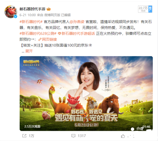 而在游戏本身的高素质吸引了新老驯兽师注意之外,官宣孙燕姿成为游戏代言人更是引爆了互联网热议,作为无数人的青春偶像,与《石器时代》同样出道23年的孙燕姿瞬间就击中了玩家们对于曾经那段香草岁月的记忆。