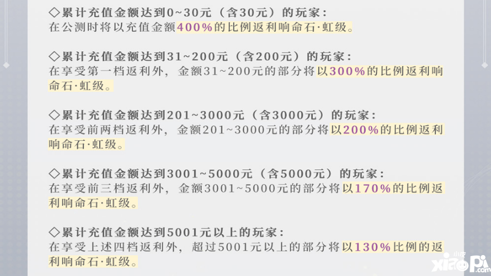 此外,在[调调测试]期间,在游戏内充值的总金额将按照1RMB:10响命石虹级的比例在公测时进行梯度返利。返利的领取方式为公测开启后,使用与[调调测试]期间进行充值的同一账号登陆游戏,领取邮件。注意是同一账号下仅有一个角色领取。返利邮件的领取有效期为90天。