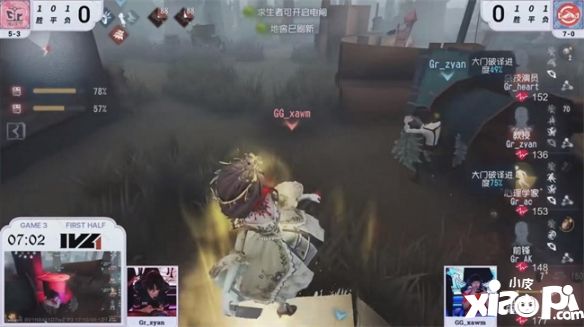 第二天第一场比赛,Gr vs 成都GG第三局上半局,Gr求生者心理学家体系运营,血性三出GG_xawm红夫人:红夫人开局快速进入追击节奏,Gr_ac心理学家利用鳞片贴近红夫人本体,躲刀进板废掉第一个镜像,红夫人进三板找机会,等待淬火远程镜像命中教授,又一个镜像将其击倒。红夫人兴奋给到撞救的前锋一刀,然后压迫其走位,挂上教授后马上抬镜逼出前锋飞轮与球,Gr_heart杂技演员及时前来补救,Gr_zyan教授一个鳞片挡刀将红夫人弹远,顺利转入沙包废墟逼出镜像,给到前锋ob空间。Gr_AK前锋几次贴窗贴板骗出刀后再翻,拿捏刀气博弈拉满,逼出第二个镜像,Gr_zyan教授自愈下板二次牵制,红夫人被迫底牌切闪现将其击倒,密码机只差一台。Gr_ac心理学家第一时间移情给前锋,Gr_AK前锋走位连躲三刀后稳定救下人,还可以持续ob,红夫人被迫放弃追击教授,镜像击倒修机的心理学家,试图机人同守。求生者方互补状态,二人在近处新起密码机给压力,Gr_zyan教授鳞片挡刀救人保自己满状态,红夫人继续追击心理学家后挂上,四人残状态,心理学家与教授上挂飞。杂技演员关键性扛伤保活教授,密码机压好,心理学家移情倒地让近处教授救人,Gr_AK前锋半状态压机,提前规避镜像,红夫人欲干扰电机,求生者方直接亮机。红夫人在大门处抬镜被杂技演员跳球废掉,Gr_zyan教授鳞片挡掉闪现刀,两边门全部点开,求生者完成三出。