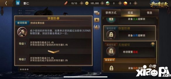 曹仁的被动技能【健壮之躯】和【铁壁防御】使他具备强大的防御能力。【健壮之躯】让他不会僵化,并增加体力;而【铁壁防御】则能减少所受到的所有伤害,特别是在单次受到超过当前体力20%的物理伤害时,将进一步减少伤害。