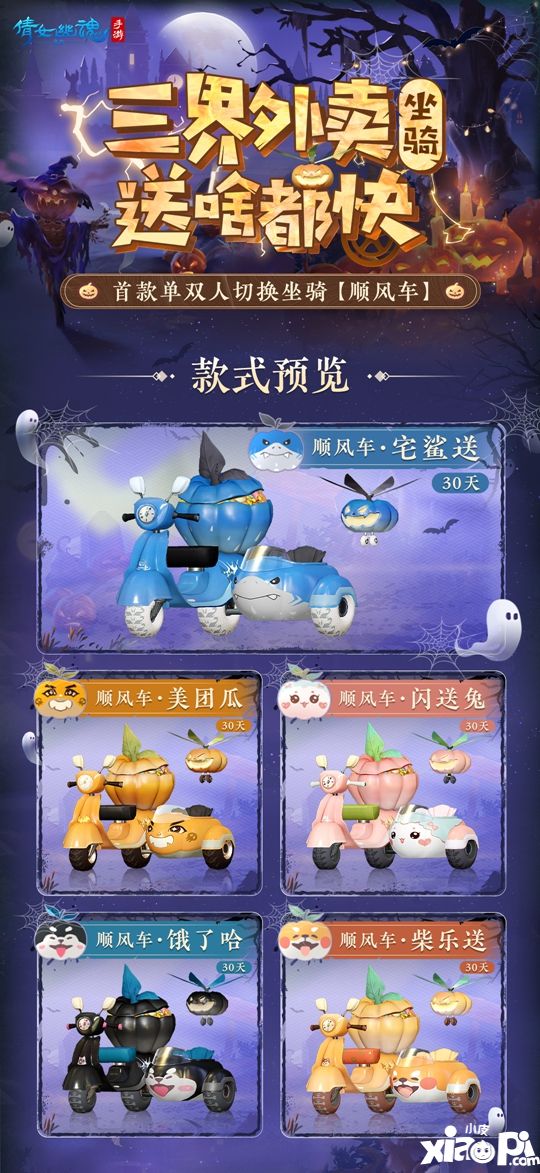全新万圣主题坐骑萌动来袭!首款双形态坐骑盲盒【顺风车】将于10月26日上线,五款风格百变的小摩托定能满足你的一切需求,让你成为三界万圣节最亮眼的“骑手”! 感兴趣的小伙伴可以持续关注“小皮游戏网”时刻了解后续相关资讯哦,下面让我们一起来看看吧!