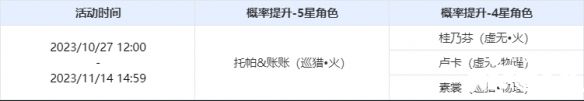 本期角色活动跃迁时间为 2023/10/27 12:00- 2023/11/14 14:59 ,包含如下内容: