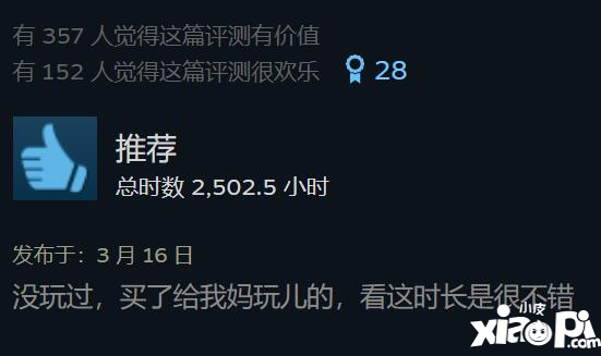 耐玩必然是很重要的原因,我们可以在评论区一探究竟:有玩家的游玩时间超过2500小时——“买了给我妈玩的,看时长是很不错”