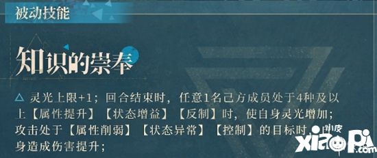 首先我们来看6的洞悉技能【知识的崇奉】,洞1——灵光上限+1,回合结束后我方任意角色有4种以上【属性提升】、【状态增益】、【反制】时,使自身灵光+1,攻击有debuff的敌方时,自身造成的伤害提升,这个特效如果是根据有4个buff以上的角色数量来提供灵光值,那6的强度真的是超模了,而且就伽菈波那的技能来看还是真的有一定可能的。