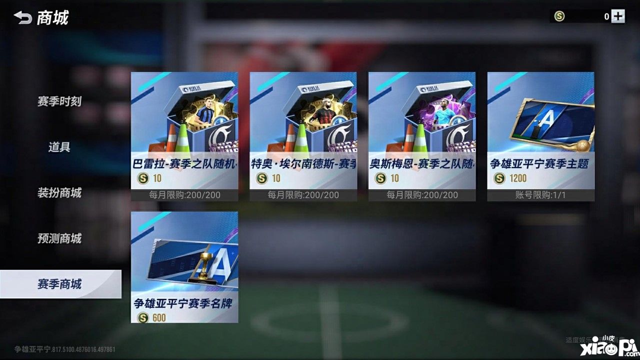 3)增加了赛季币的产出,可用于赛季商城兑换奖励,12月赛季商城将上架「争雄亚平宁主题」、「争雄亚平宁名牌」以及「争雄亚平宁随机礼包」,兑换随机礼包后将有概率获得巴雷拉、特奥·埃尔南德斯、奥斯梅恩的赛季之队赛季时刻片段、限时招募券、招募券、训练锥等道具奖励。