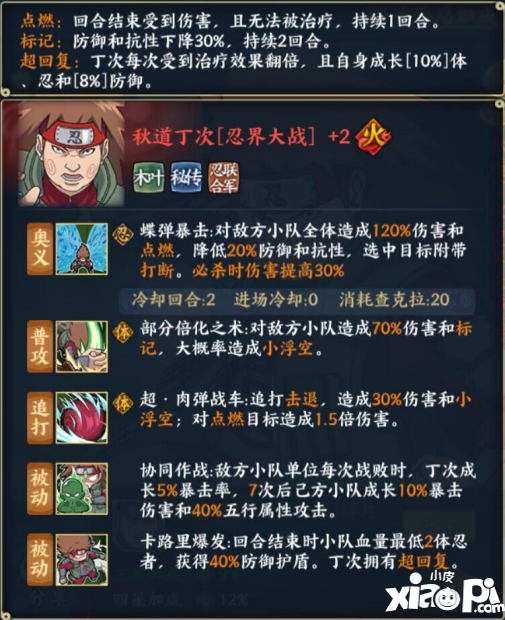 卡路里爆发:回合结束时小队血量最低2体忍者,获得40%防御护盾。丁次拥有超回复。