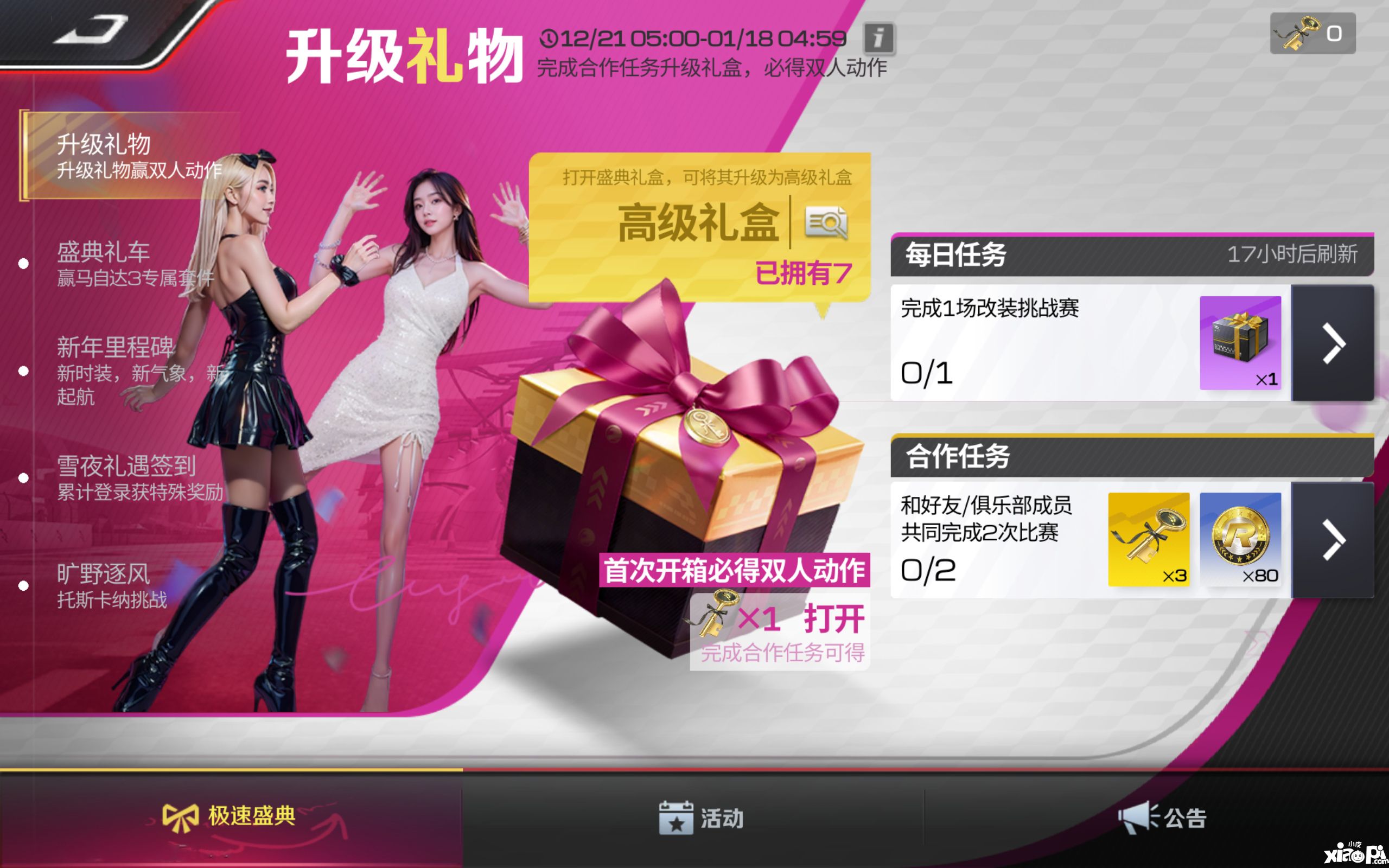 极速盛典主题活动“升级礼物”持续进行中,完成每日任务即可打开盛典礼盒领取奖励。叫上车友共同完成合作任务,即可获得合作钥匙打开高级礼盒,首次打开高级礼盒必定获得全新双人动作【双人成行】,还有限定【车顶装饰】、【极速盛典头像框】、海量钻石等奖励等你来开盒!