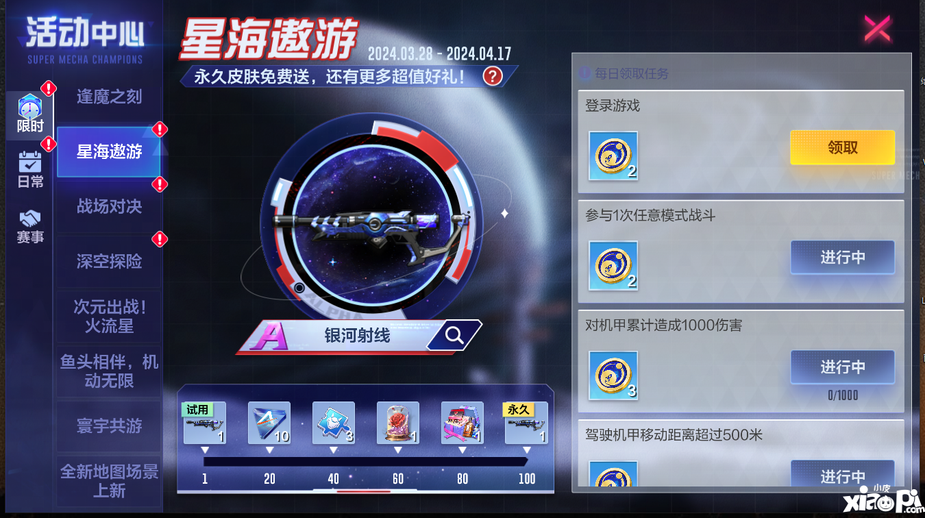 3月28日至4月17日,参加星海遨游活动即可获取活动积分,最高可兑换激光镭射枪A级别外观“银河射线”!