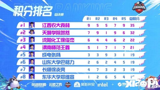 第十二届英雄联盟全国高校联赛云顶之弈赛道总决赛采取R5积分赛制,八位选手总共进行五局游戏,根据排名获得积分,五局游戏全部结束以后积分最高的选手将会获得本次总决赛冠军。在此感谢赞助商机械革命和光明莫斯利安对本届赛事的赞助。