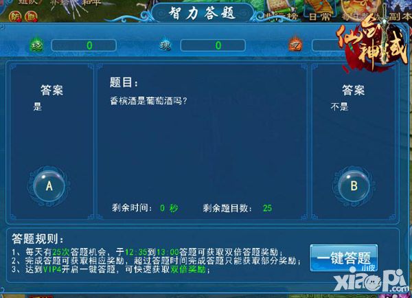 参加“智力答题”的条件很简单,玩家每天通过日常面板选择答题活动就可以。游戏中共有25道题,玩家可以24小时进行答题。顺利完成的话,便可获得大量的经验、仙魂、真气哟!同时也要记住,每天1235-1300是双倍奖励时间,强烈推荐此时间段进行答题。证明自己是学霸的时刻到啦!