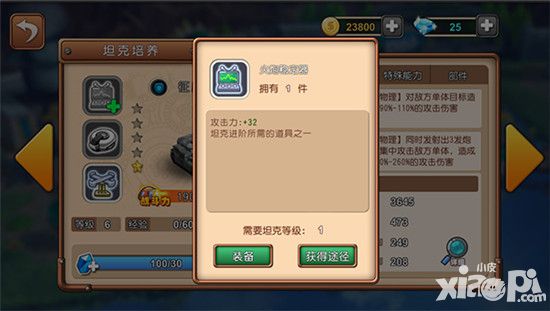 坦克进阶界面中显示了坦克进阶所需要装备的零件,当玩家装备所有零件后便可以进行进阶。