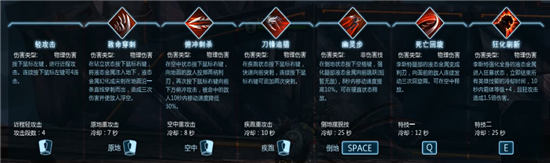 俯冲刺杀:俯冲刺杀在空中状态按下鼠标右键,向地面的敌人投掷两柄利刃,再次按下鼠标右键向前下方俯冲攻击,被命中的敌人10秒内移动速度降低30%。