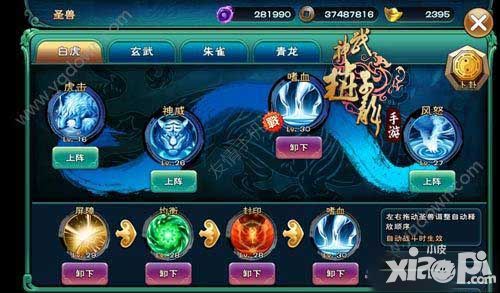 混沌未开,盘古开天,四方天星各得五行之精,化而为神,是为圣兽,至黄帝时,轩辕黄帝请四圣兽分别镇守四方,调阴阳、顺风水,自此被尊称为“上神”、“神兽”。65游戏《武神赵子龙》圣兽与你一起并户作战,青龙、白虎、朱雀、玄武是增强战斗力最有效的方法之一,合理利用助你战斗中永占优势!