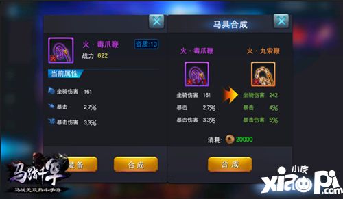 三个同名马具可升级为高一品质的马具,红色品质的马具就无法继续升级了哟。快让你的爱驹也穿上新装,跟随你一起征战沙场!