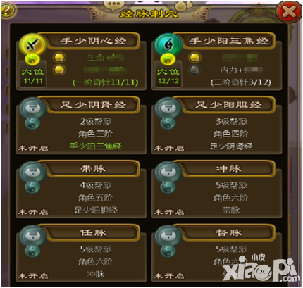 根据不同的角色阶级和玩家帮派的等级,经脉被分成了8个不同阶段。每一阶的经脉,当玩家打通了全部的穴位后,将激活经脉加成效果,该效果激活时会给大侠们带来一定的固定属性收益,该属性收益值只会在经脉穴位全部打通后触发哦。